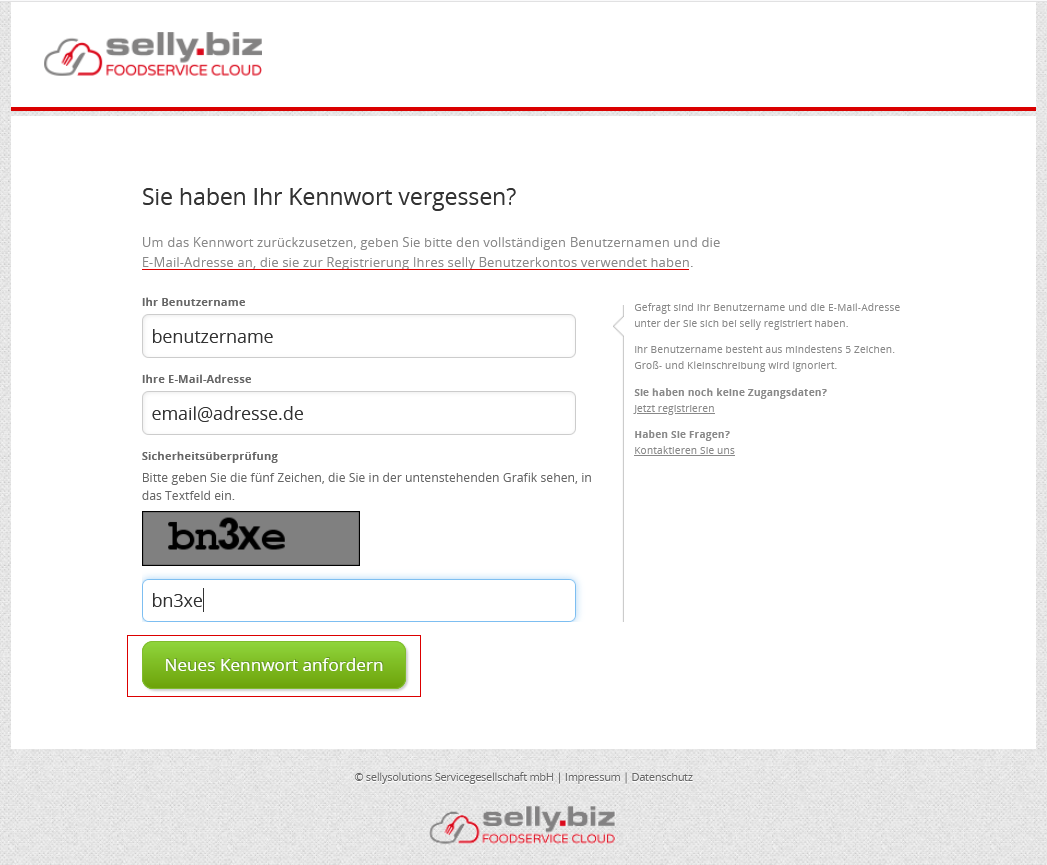 Nach Eingabe der Zeichen der Sicherheitsprüfung fordern Sie ein neues Kennwort an.
