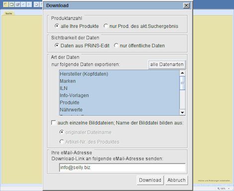 Sie haben die Möglichkeit, den Datenumfang zu wählen bzw. einzuschränken. Es können Informationen zu allen Ihren in der Datenbank vorhanden Produkten downloaden bzw. einen Download für die Produkte in der aktuellen Ergebnisliste durchzuführen.