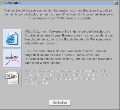 Sie wählen zwischen der Ausgabe eines HTML- oder PDF-Dokuments und starten den Druckvorgang über die rechte Maustaste.