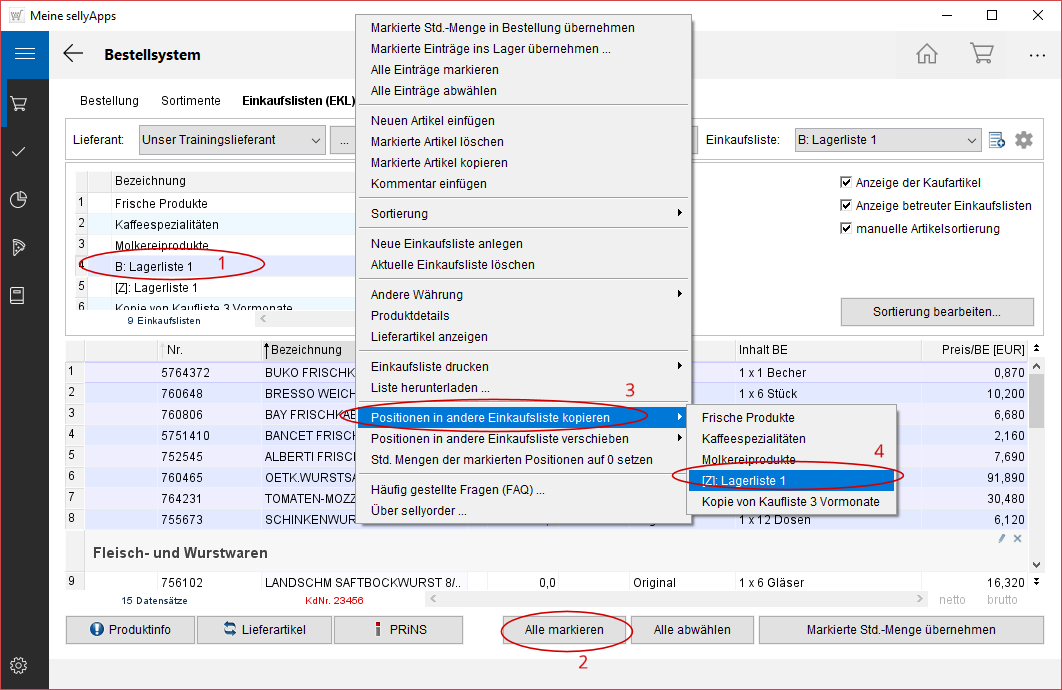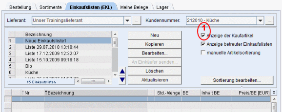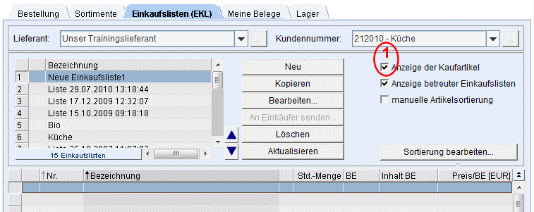 Hinweis: Kauflisten (Checkbox „Anzeige der Kaufartikel“ ist aktiviert) (s. Markierung 1).