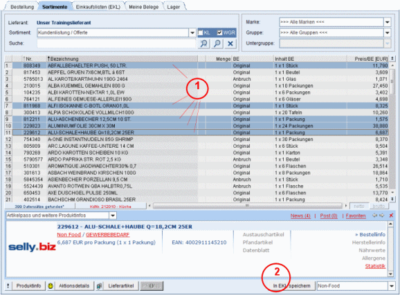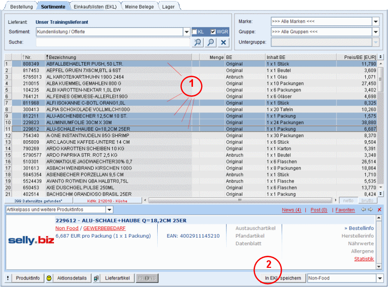 Im Reiter Sortimente markieren Sie die Artikel, die Sie übernehmen möchten und wählen in der unteren Liste eine Einkaufsliste (s. Markierung 1) aus. Mit Klick auf die Schaltfläche [In EKL speichern] (s. Markierung 2) werden die markierten Artikel in die gewählte Einkaufsliste gespeichert, d.h., Sie erweitern die gewählte Einkaufsliste um die markierten Artikel.