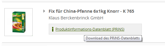 Je nach Vorkommen in der Datenbank werden für die Artikel u.a. die Produktinformations-Datenblätter (PRiNS) zum Download angeboten.