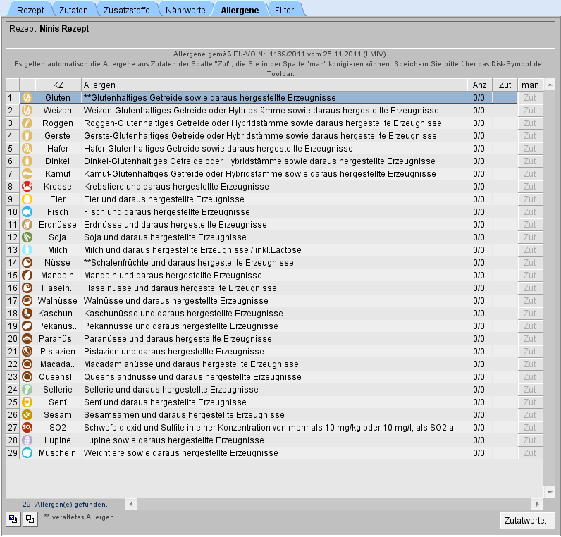 Veraltete Zusatzstoffe werden mit "**" markiert und nur noch angezeigt, wenn sie mit ja oder nein der Zutat zugewiesen wurden.
