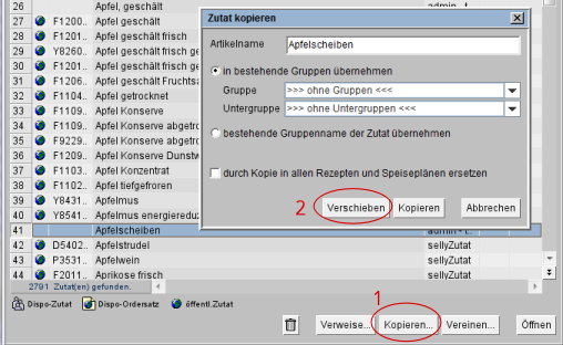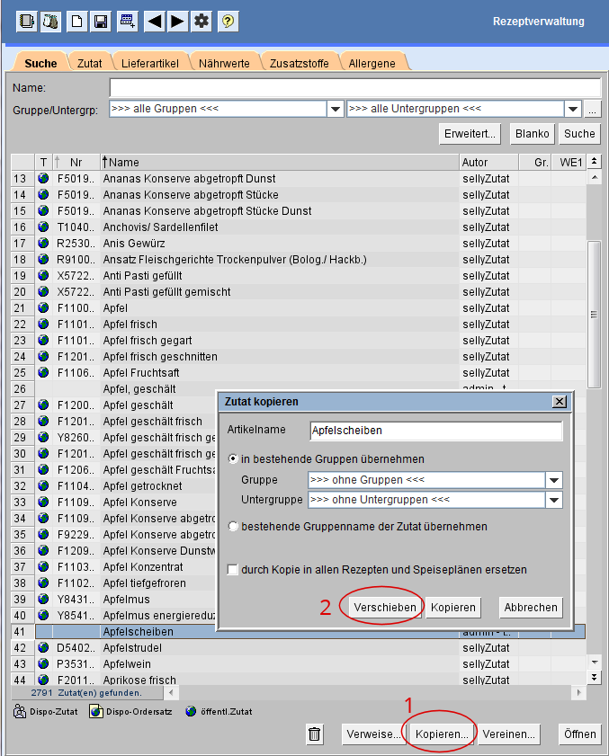 Einführung einer neuen Schaltfläche [Verschieben], die eine oder mehrere Zutaten in eine neue Gruppe verschiebt. Sollen öffentliche Zutaten (d.h. nicht eigene) verschoben werden, wird eine Fehlermeldung angezeigt und das Verschieben rückgängig gemacht.