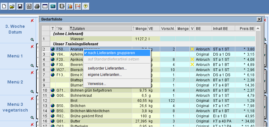 Für Zutaten mit einem alternativen Lieferartikel (LKW-Symbol) gibt es über das Menü der rechten Maustaste nunmehr in der Bedarfsliste die Möglichkeit, den alternativen Lieferartikel auf den Standardlieferartikel zurückzusetzen.