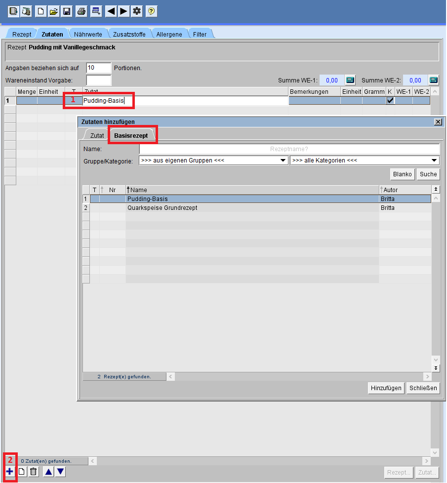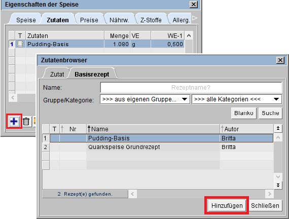 Im Reiter [Zutaten] des Rezept-Editors können Basisrezepte hinzugefügt werden: