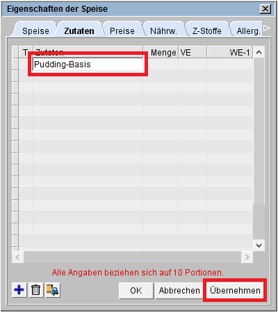 Im Reiter Zutaten der Speise können Basisrezepte hinzugefügt werden:
