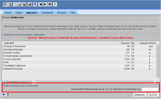 Die Referenzmenge wird aus dem Rezept in die Speise übernommen und kann auch dort geändert werden, da die Menge der Speisezutaten oder die Speisezutaten selbst geändert werden können.