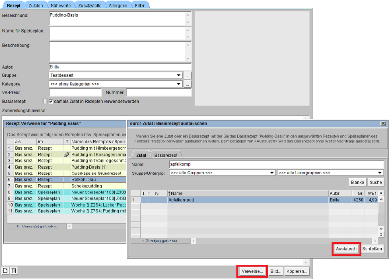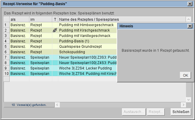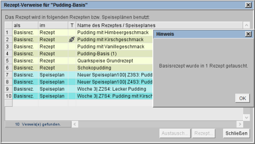 Ein Löschen oder Aufheben des Kennzeichens für ein Basisrezept ist bei verwendeten Basisrezepten erst wieder möglich, wenn diese durch andere Basisrezepte oder Zutaten ausgetauscht wurden.
