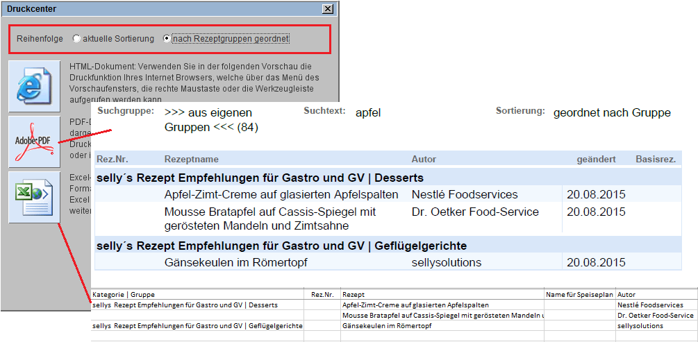 Über das Druckersymbol kann eine Liste der Rezeptnamen für die ausgewählten Sucheinstellungen angezeigt werden.