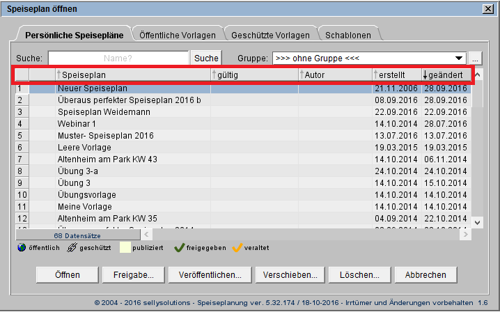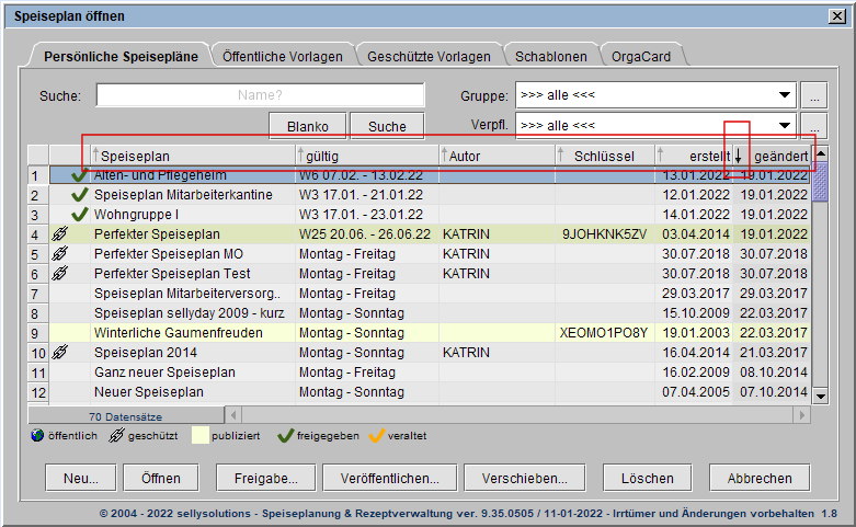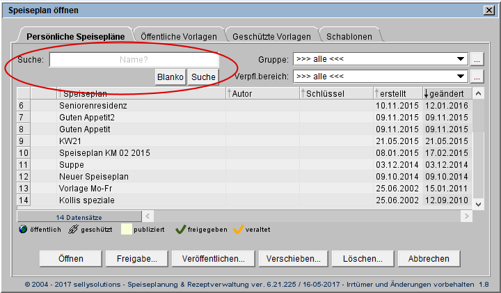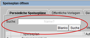 Im Öffnen-Dialog der Speiseplanung kann nach einer Zeichenfolge im Namen des Speiseplanes gesucht werden.