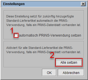 Die Schaltfläche [Alle setzen] (s. Markierung 2) setzt alle Haken für die PRiNS-Verwendung bei Standard-Lieferartikeln, die ein PRiNS-Datenblatt besitzen.