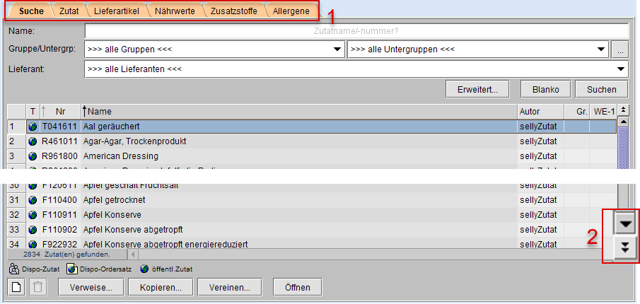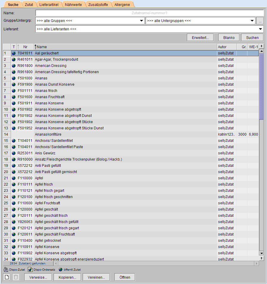 Es öffnet sich der Such-Dialog des Zutaten-Editors und die Liste der bereits vorhandenen Zutaten wird ausgegeben.