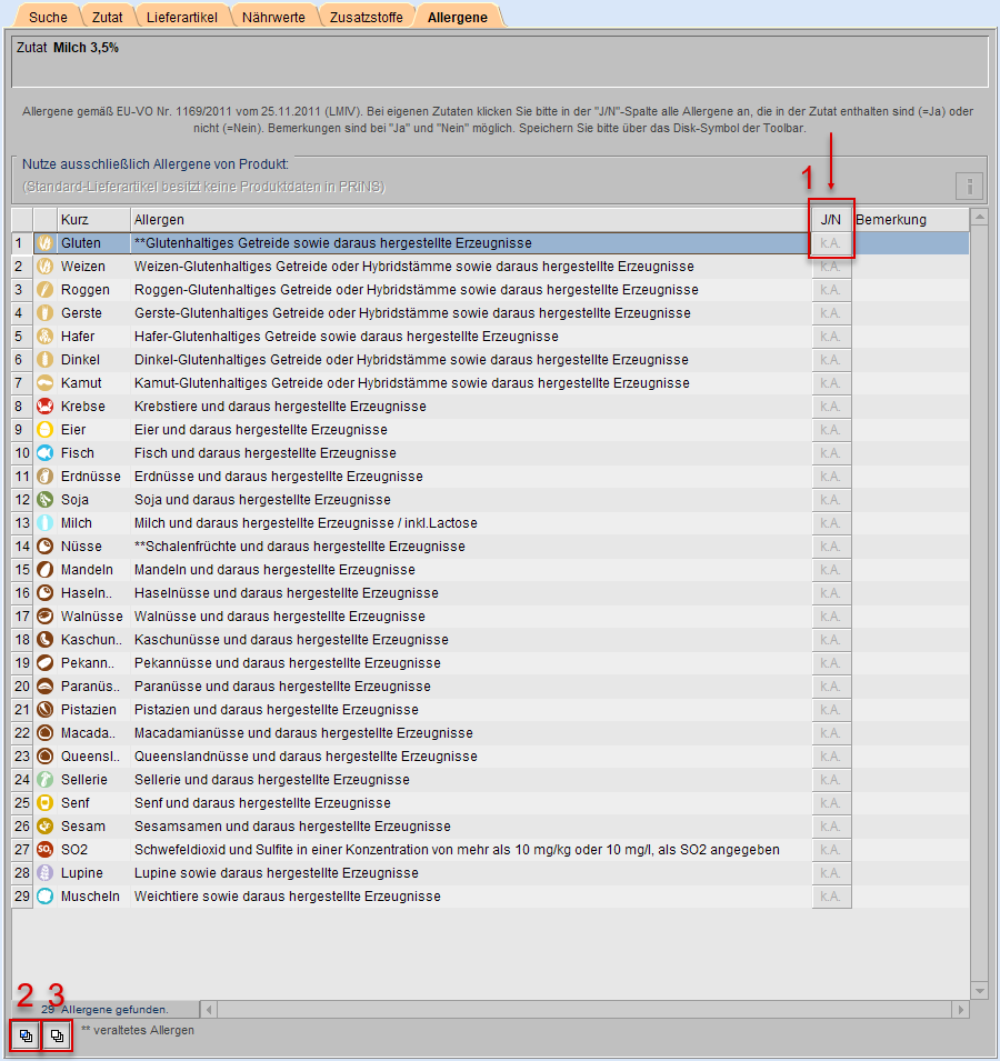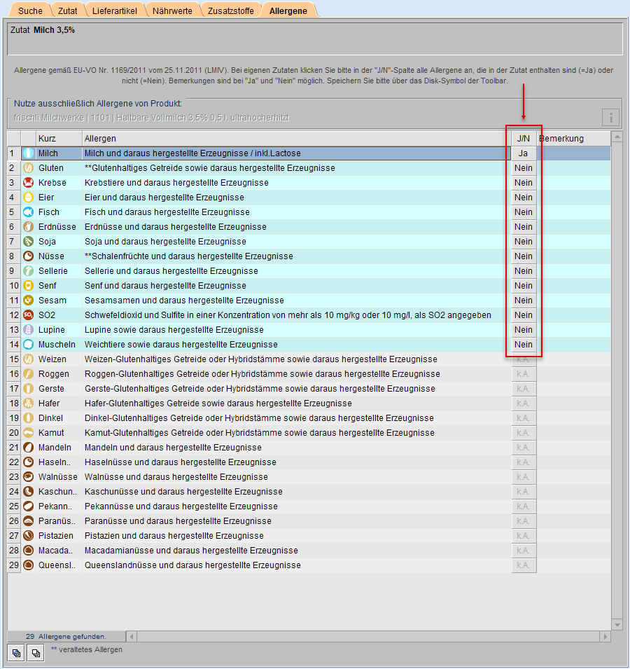 Sie markieren die Allergene mit Klick in die Spalte J/N (s. Markierung 1).