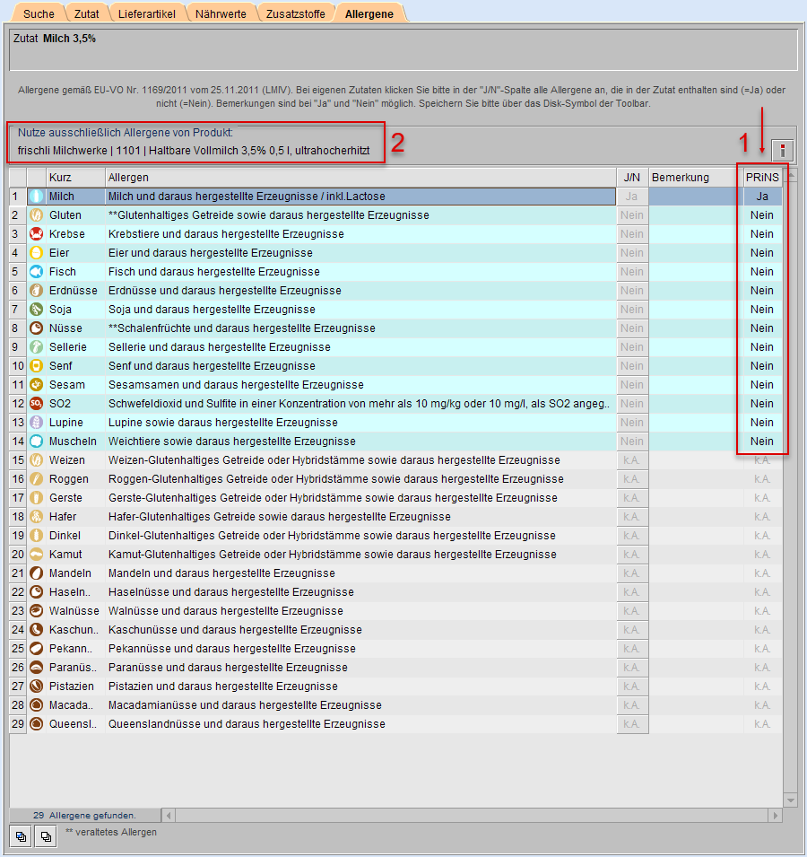 Im Beispiel Milch 3,5% waren Allergenangaben beim Lieferartikel (im Produktdatenblatt) vorhanden, somit existieren nach Kopie 14 Allergenkennzeichnungen (s. Markierung).