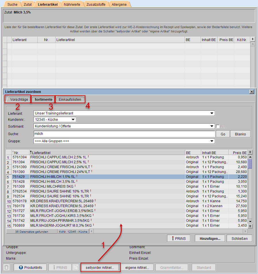 Um Ihre Zutat mit einem Artikel aus einem sellyorder-Sortiment zu verknüpfen, wählen Sie die Schaltfläche [sellyorder Artikel...] (s. Markierung 1), erhalten den Dialog Lieferartikel zuordnen und wählen den Lieferartikel aus der Vorschlagsliste, einem Sortiment oder einer Einkaufsliste aus.