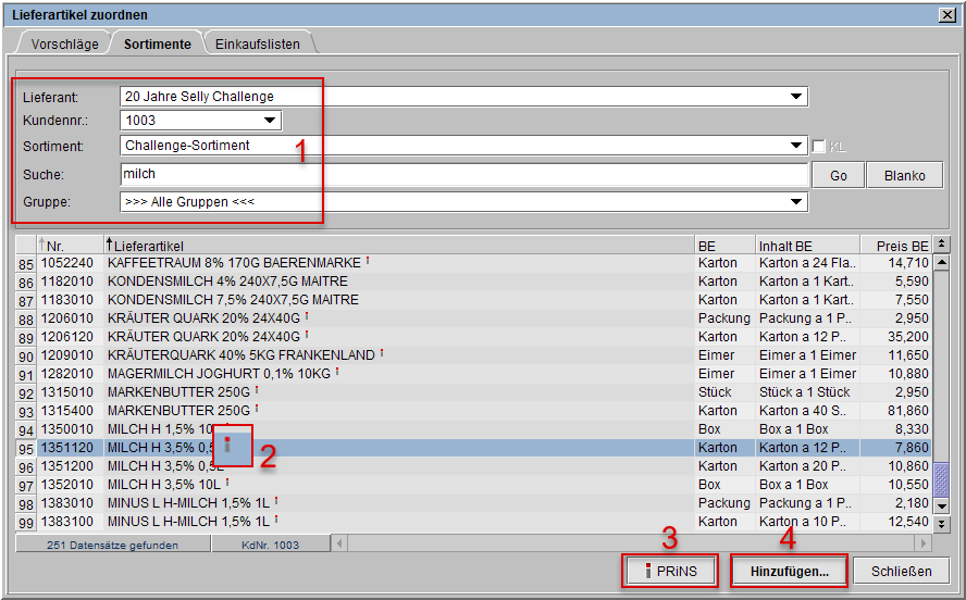Für einen Suchvorgang können Sie einen Lieferanten, die entsprechende Kundennummer, das Sortiment und Warengruppen einbeziehen (s. Markierung 1).