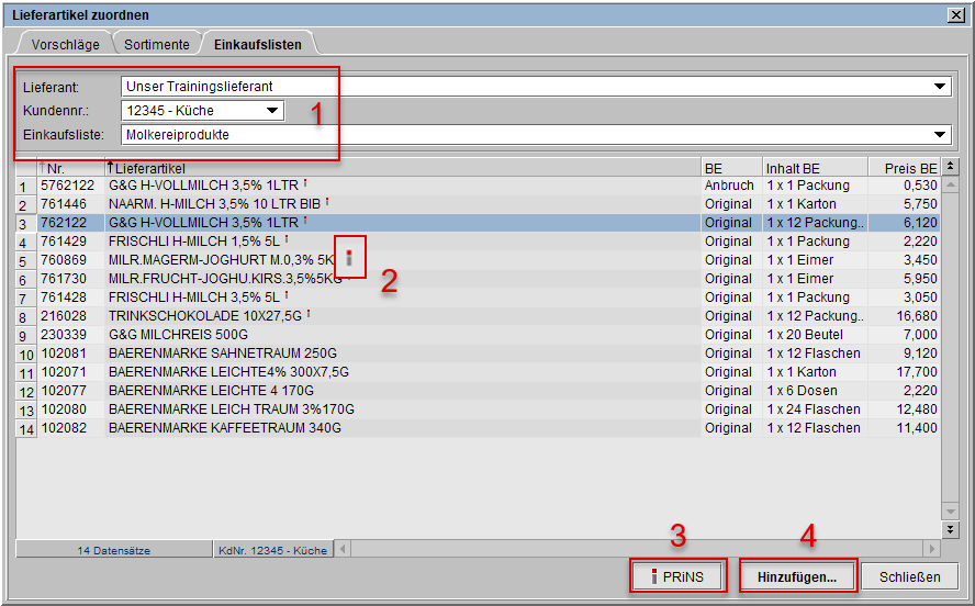 Für die Anzeige der Artikelliste wählen Sie einen Lieferanten, die entsprechende Kundennummer und Einkaufsliste (s. Markierung 1).