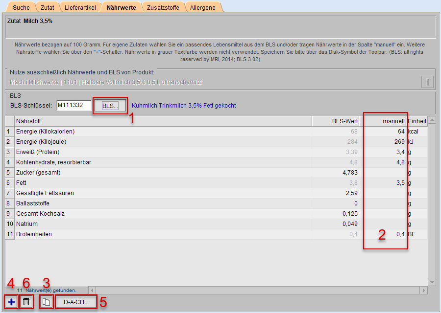Im Beispiel Milch 3,5% (s. Markierung 2) waren Nährstoffangaben beim Lieferartikel (im Produktdatenblatt) vorhanden, somit existieren nach Übernahme acht Nährstoffwerte.