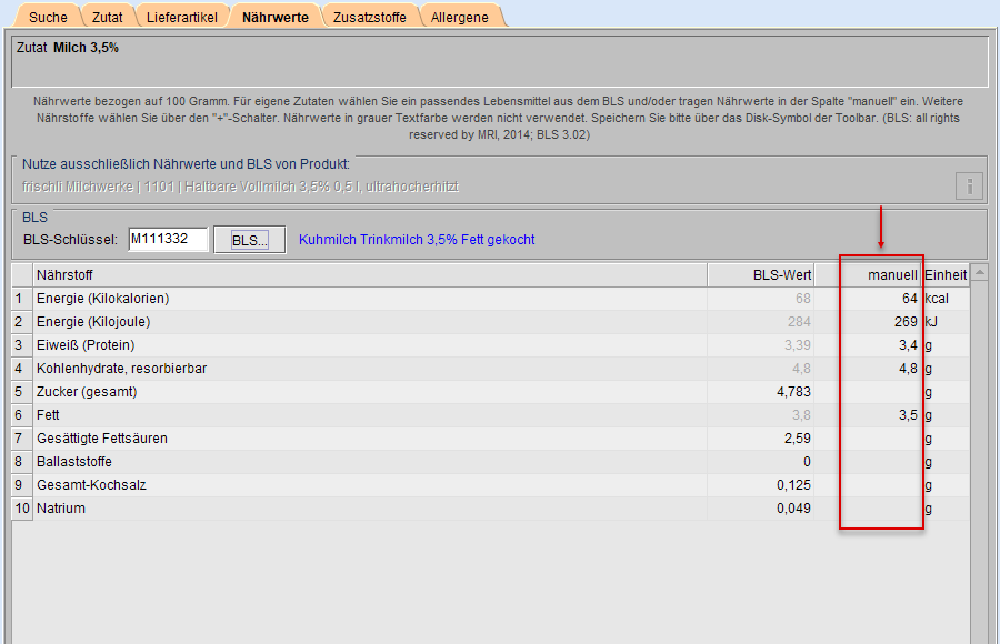Die kopierten Nährstoffwerte aus dem Produktdatenblatt sind in der Spalte manuell zu sehen (s. Markierung).