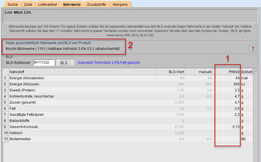 Vorgang der Nährwertübernahme s. Nährwerte aus Produktdatenblatt (PRiNS) automatisch übernehmen