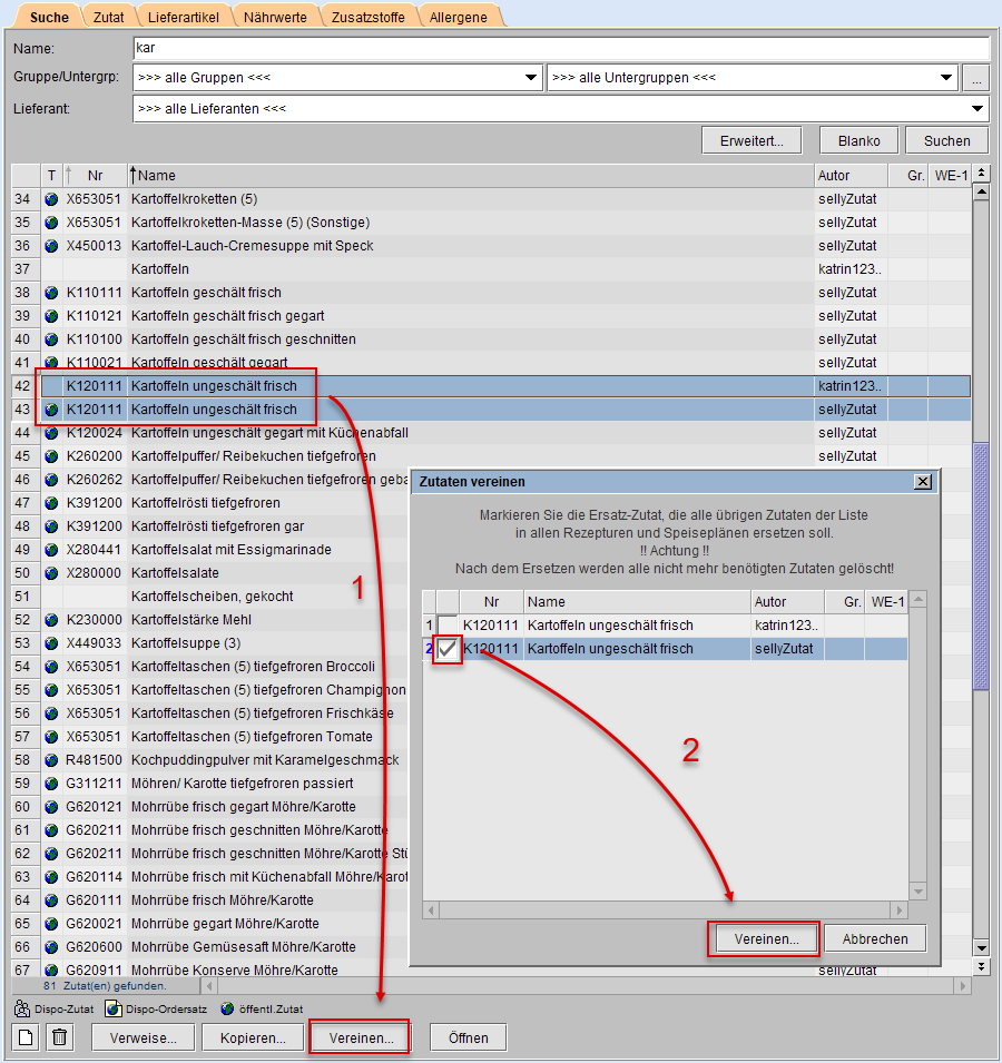 Beispiel: Zutat A und Zutat B werden vereint auf Zutat B. Im Ergebnis wird jede Zutat A in allen Rezepten und Speiseplänen durch die Zutat B ersetzt und auch der