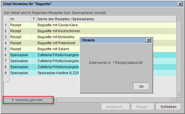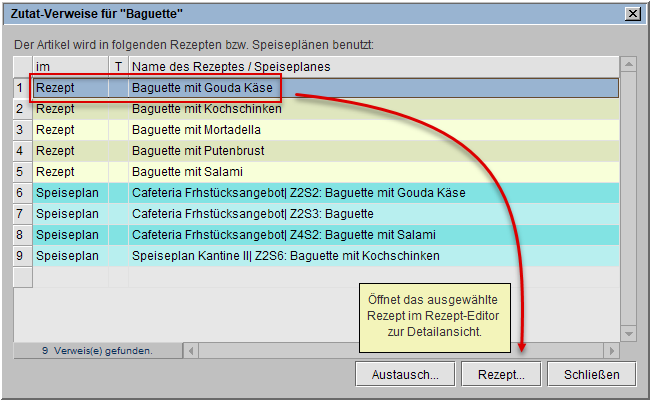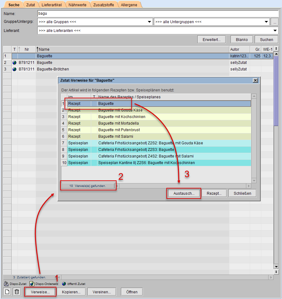 Möchten Sie die Zutat Baguette in dem ausgewählten Rezept oder Speiseplan des Fensters Zutat-Verweise für "Baguette" austauschen, markieren Sie den Verweis und klicken auf [Austausch...] (s. o. Markierung 3).