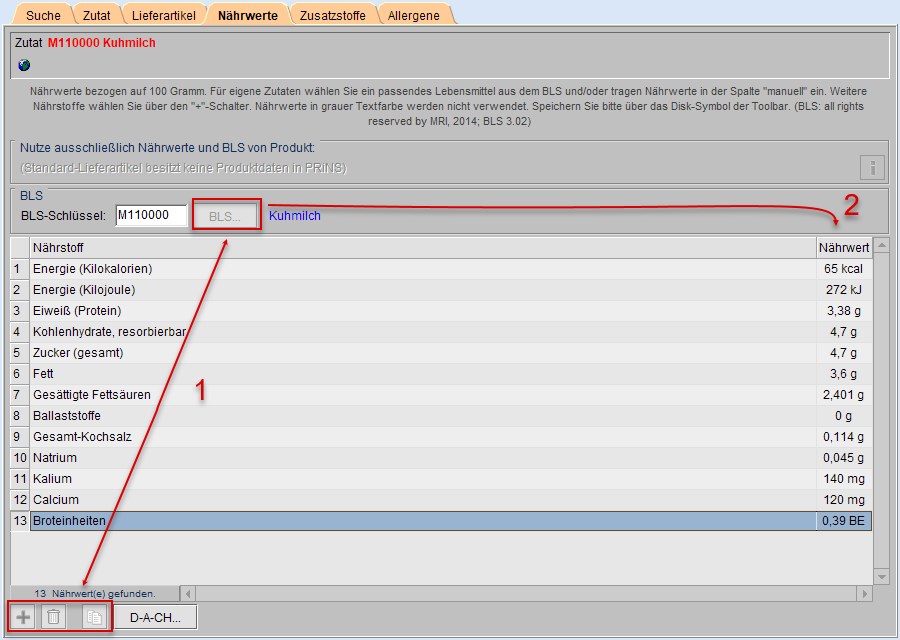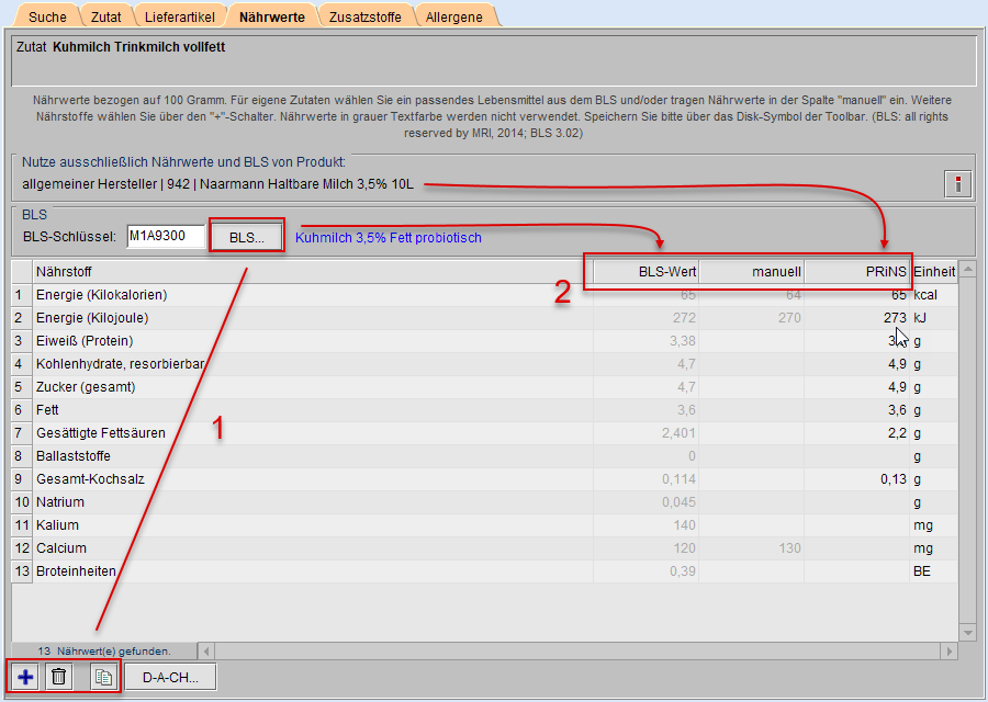 Die Schaltflächen zum Anpassen der Zutatwerte sind inaktiv (s. Markierung 1). Er werden nur die Nährwerte angezeigt, die auf einem Lebensmittel aus dem BLS basieren (s. Markierung 2).