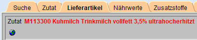 Bei einer eigenen Zutat ist die Spalte T (Typ) ohne Kennzeichnung. Sie können bei dieser Zutat die notwendigen Nährwertangaben selbst pflegen, entweder durch Übernahme der Werte von einem Lieferartikel oder durch direktes Eintragen. Analog gilt dies für die deklarationspflichtigen Angaben zu Zusatzstoffen und Allergenen.