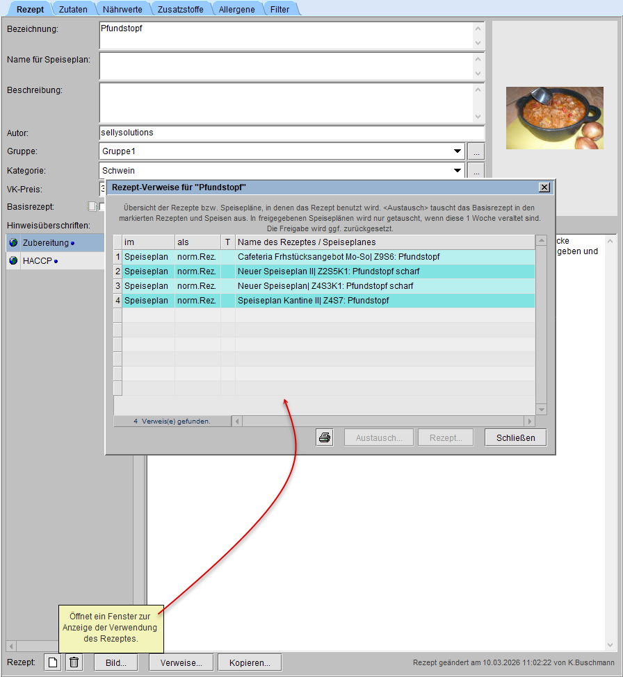 Im letzten Verweis Speiseplan Kantine II|Z4S7: Pfungstopf zeigt die Angabe Z4S7, dass dieses Rezept in der Zeile 4 und in der Spalte 7 verwandt wurde.