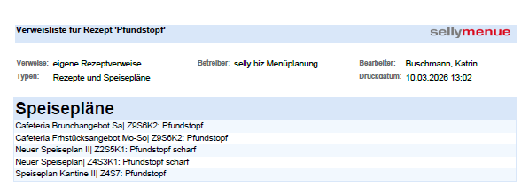 Die Übersicht der Speisepläne, in denen das Rezept verwendet wird, können Sie ausdrucken und nutzen das Drucker-Symbol im Dialog Rezeptverweise für ...