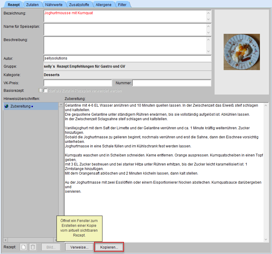 Sie nutzen zum Verschieben ebenfalls den Kopierdialog Rezept kopieren und können ein eigenes Rezept in eine andere Gruppe und/oder Kategorie verschieben.