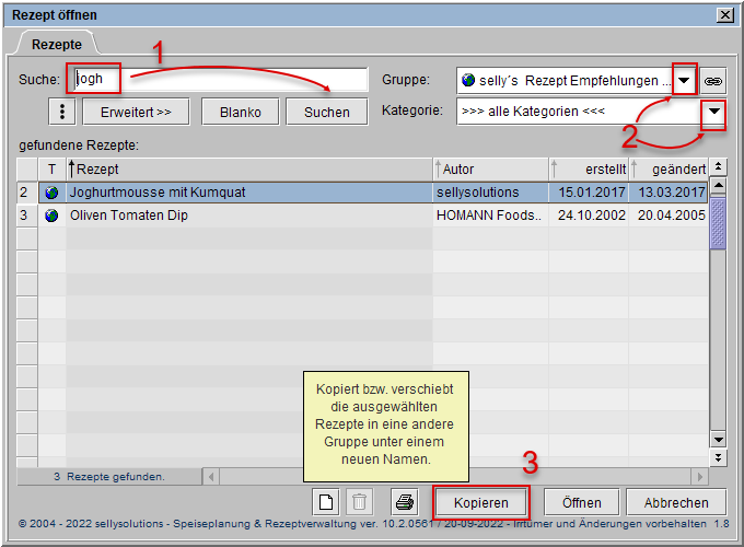 Um ein Rezept zu finden, führen Sie ggfs. eine Rezeptsuche durch (s. Markierung 1) oder schränken, durch Auswahl einer Gruppe und/oder Kategorie, die Rezeptliste ein (s. Markierungen 2). Sie markieren das Rezept, welches Sie kopieren möchten.