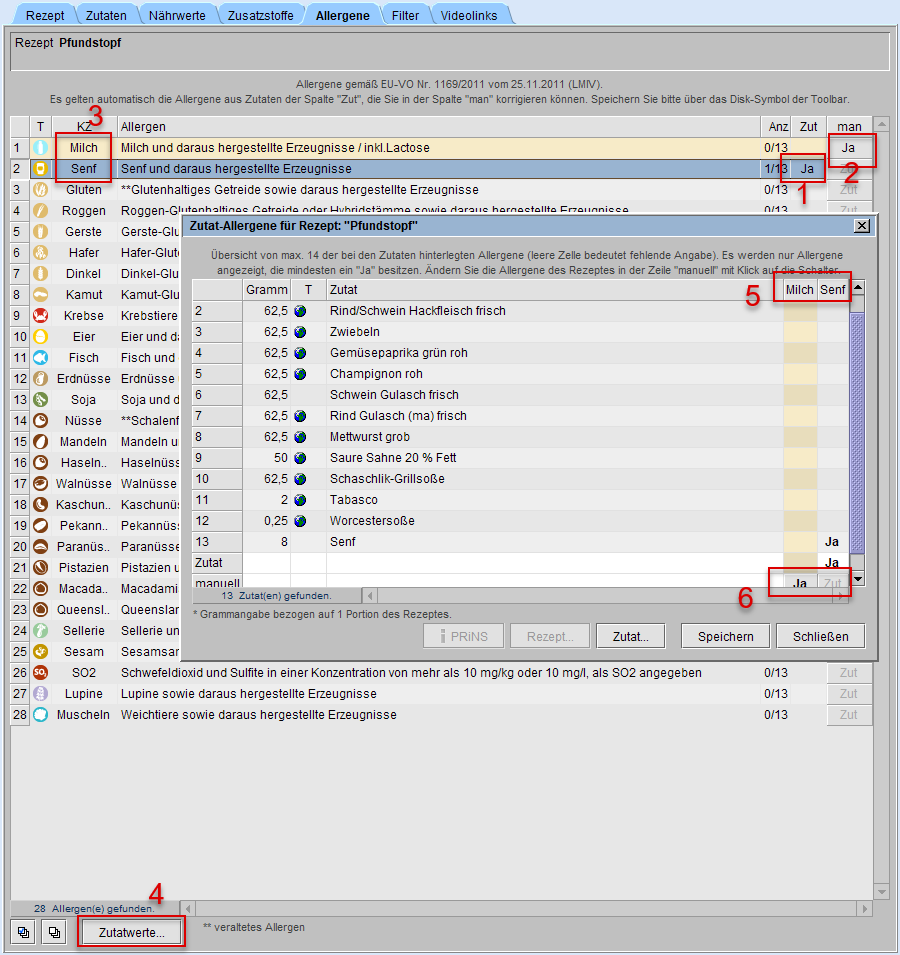 Bringt eine Zutat bereits ein Allergen mit, wird dieses Allergen in der Spalte Zut ausgewiesen (s. Markierung 1).