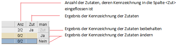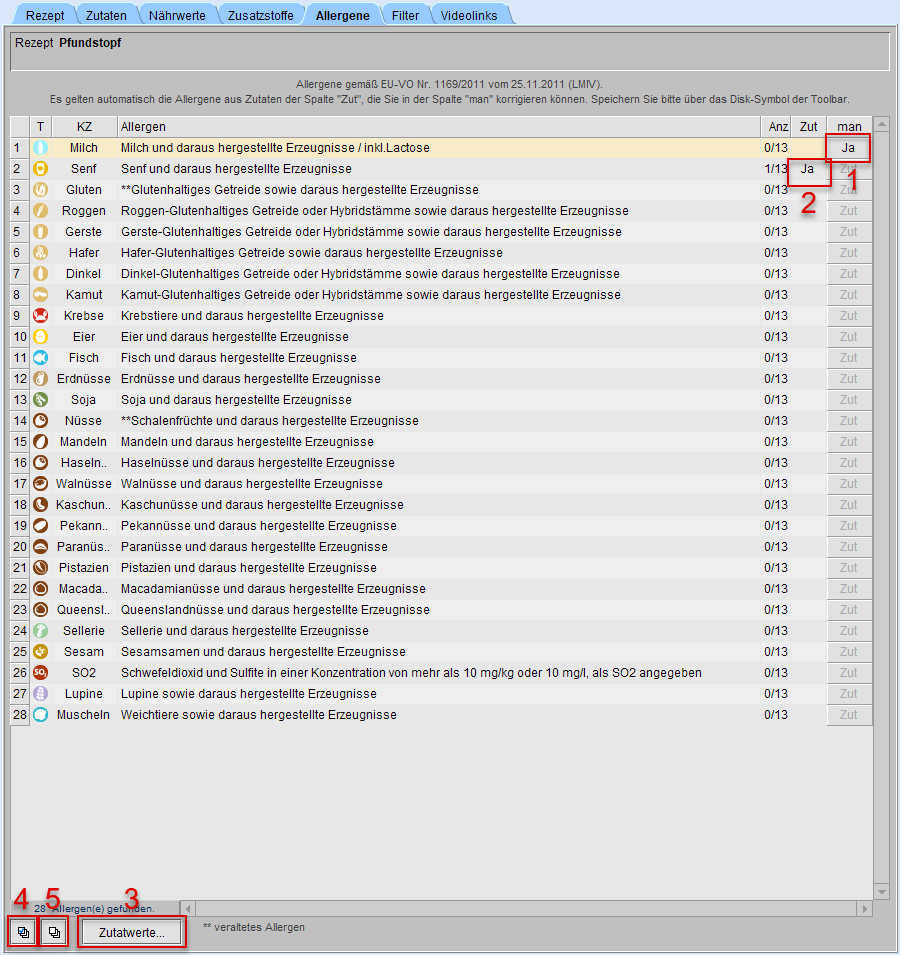 Bringt eine Zutat bereits ein Allergen mit, wird dieses Allergen in der Spalte Zut ausgewiesen (s. Markierung 2).