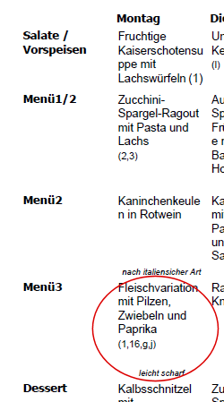 Im Beispiel Menü3 sehen Sie die Rezeptbezeichnung aus dem Feld Name für Speiseplan und die Bemerkung aus dem Feld Beschreibung darstellt.