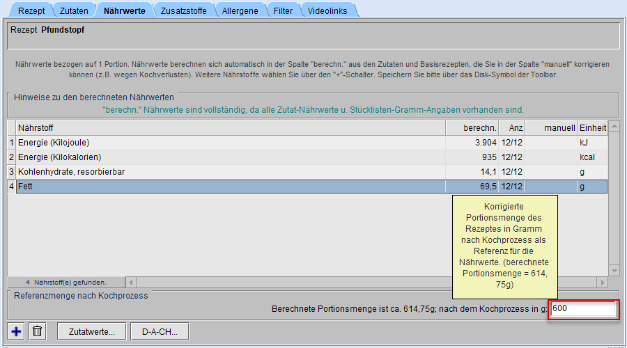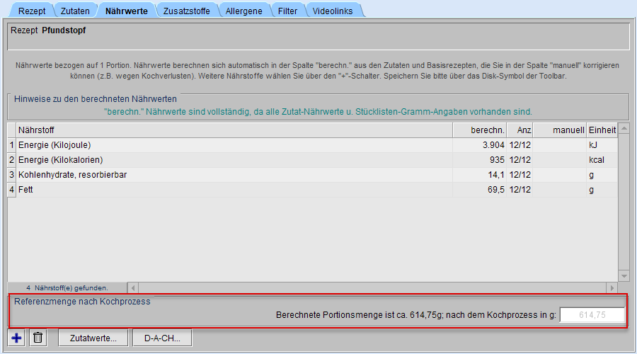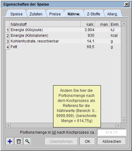 Im Reiter Nährwerte des Rezepteditors besteht die Möglichkeit, sich entweder nur die berechnete Gesamtzutatenmenge pro Portion (s. a. Nährwerte im Rezeptdruck) anzeigen zu lassen oder diese durch Einbeziehung von Kochverlusten etc. zu korrigieren. Wurde keine Menge manuell eingetragen, erscheint in grauer Textfarbe die berechnete Portionsmenge.