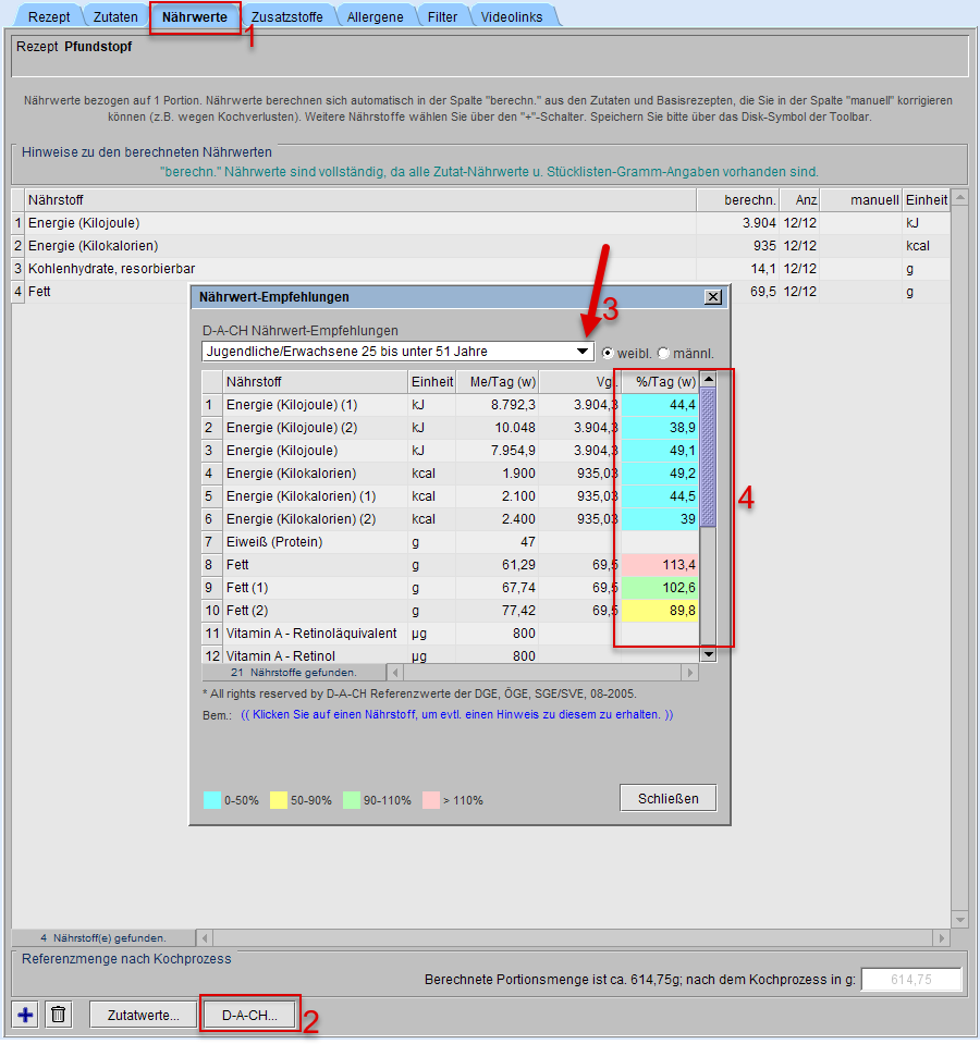 Im Reiter Nährwerte (s. Markierung 1) können Sie mit Klick auf die Schaltfläche [Dach...] (s. Markierung 2) die Nährwert-Empfehlungen aufrufen.