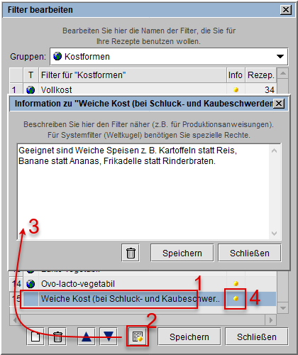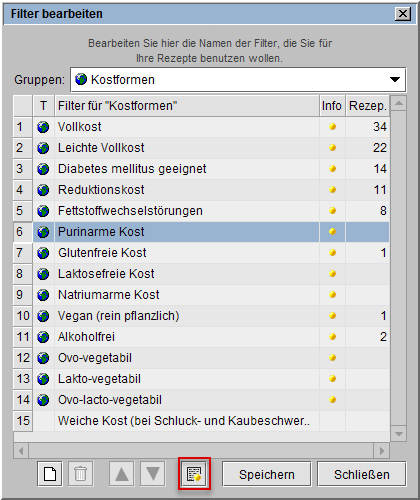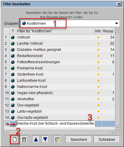 Bildbeispiel: Kostformen) sehen Sie die vorhandenen Einzelfilter und können sich bei