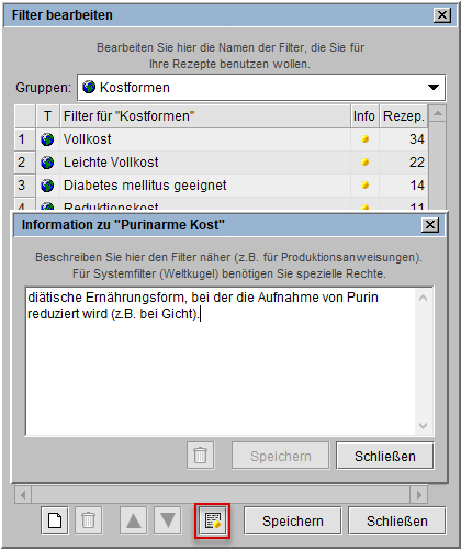 Im Dialog Filter bearbeiten ist in der Spalte Rezept die Anzahl der Rezepte zu sehen, bei denen bereits der Einzelfilter Verwendung findet.
