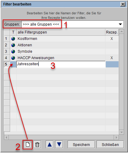 (s. Markierung 2) und geben in die leere Zeile die Filtergruppenbezeichnung ein (s. Markierung 3).