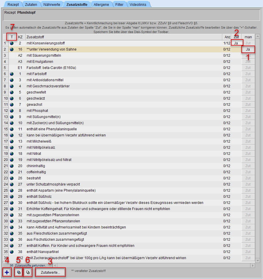 Bringt eine Zutat bereits einen Zusatzstoff über die Lieferartikel-Zuordnung mit, wird dieser Zusatzstoff in der Spalte Zut ausgewiesen (s. Markierung 2).