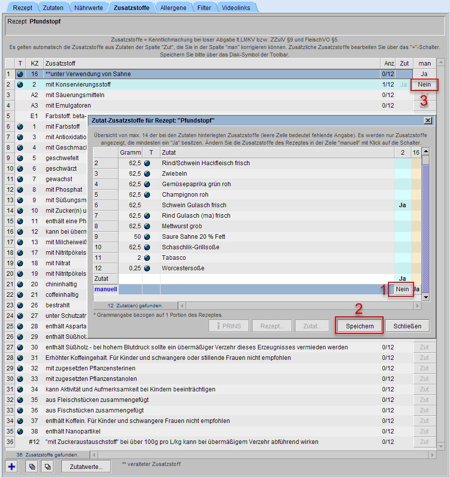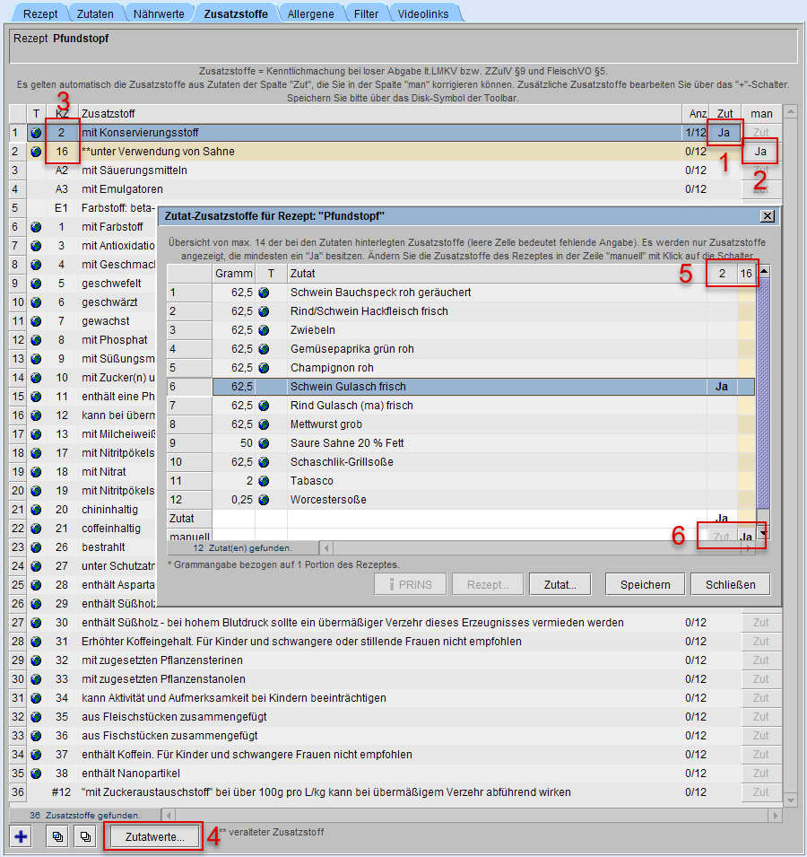 Mittels der Schaltfläche [Zutatwerte...] (s. Markierung 4) erhalten Sie weitere Informationen zu den Zutat-Zusatzstoffen (Bildbeispiel: Zutat-Zusatzstoffe für Rezept: "Pfundstopf").