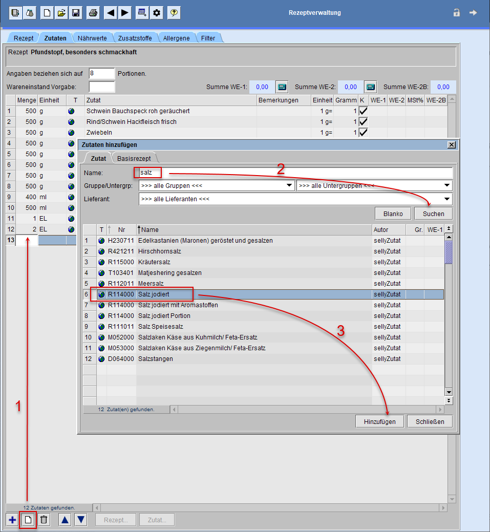 Zum Auffinden einer Zutat geben Sie einen entsprechenden Suchbegriff in das Feld Name ein und starten den Suchlauf mit Klick auf [Suche].