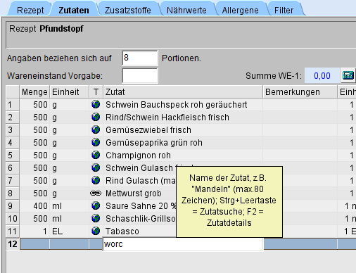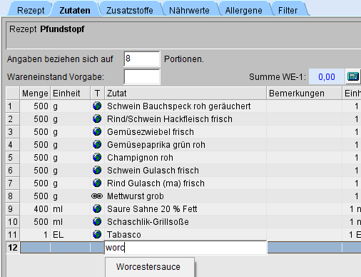 Sie öffnen das Rezept und wechseln zum Reiter Zutaten. Zum Auffinden einer Zutat geben Sie mindestens zwei Buchstaben des Suchbegriffs in die Spalte Zutat ein (im Beispiel: worc).