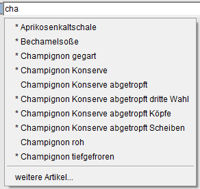 Gibt es mehr als zehn Ergebnisse, haben Sie, über den Eintrag weitere Artikel am Listenende die Möglichkeit, den Zutatenbrowser zu öffnen, um dort ggfs. eine andere Auswahl vorzunehmen.