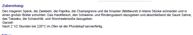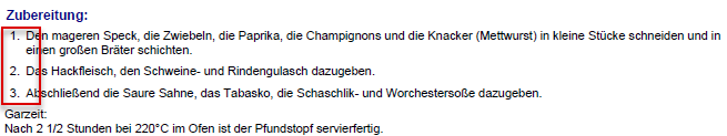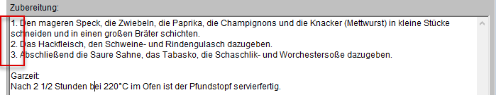 Wenn in den Zubereitungen eine Zeile mit „1.“ (oder anderer Ziffer) beginnt (s. Beispiel links), wird der Text zur besseren Lesbarkeit eingerückt (s. Beispiel rechts).