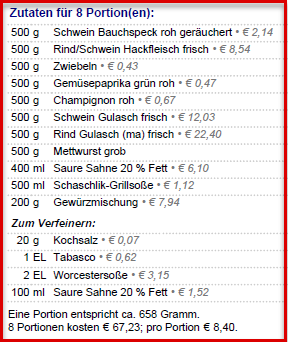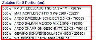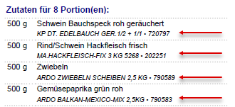 Diese Option fügt eine weitere Zeile unter jeder Zutat ein, wenn für diese ein Lieferartikel vorhanden ist. Es werden der Name des Lieferartikels sowie seine Bestellnummer kursiv dargestellt. Wenn sowohl die Nährwerte als auch die Zusatzstoffe abgewählt wurden, wird zusätzlich der Lieferantenname dargestellt.