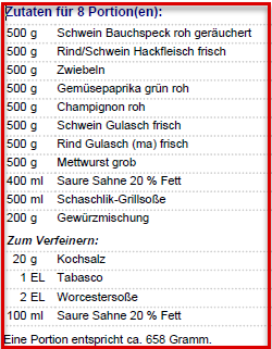 Über diese Option kann der komplette Abschnitt Zutaten aus- oder eingeblendet werden. Sollte in der Zutaten-Ansicht ein Basis-Rezept aufgeklappt sein, wird dieses unter der jeweiligen Zutat farbig ausgedruckt (s. Rezeptbeispiel Rezept drucken). Bemerkungen zu einer Zutat werden kursiv dargestellt.