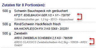 Es wird eine weitere Zeile unter jeder Zutat eingefügt, wenn für den Lieferartikel ein Produkt vorhanden ist. Es wird der Name des Produktes, seine Artikelnummer sowie der Hersteller-Kurzname kursiv und grau dargestellt.